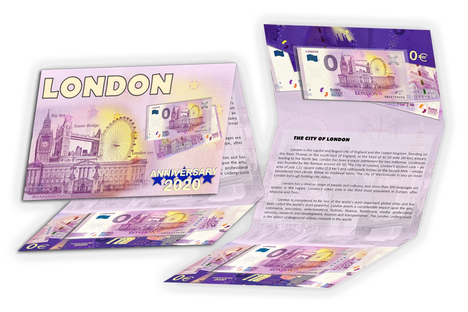 Oficiálny folder LONDON (set dvoch Euro Souvenir bankoviek) obsahuje: