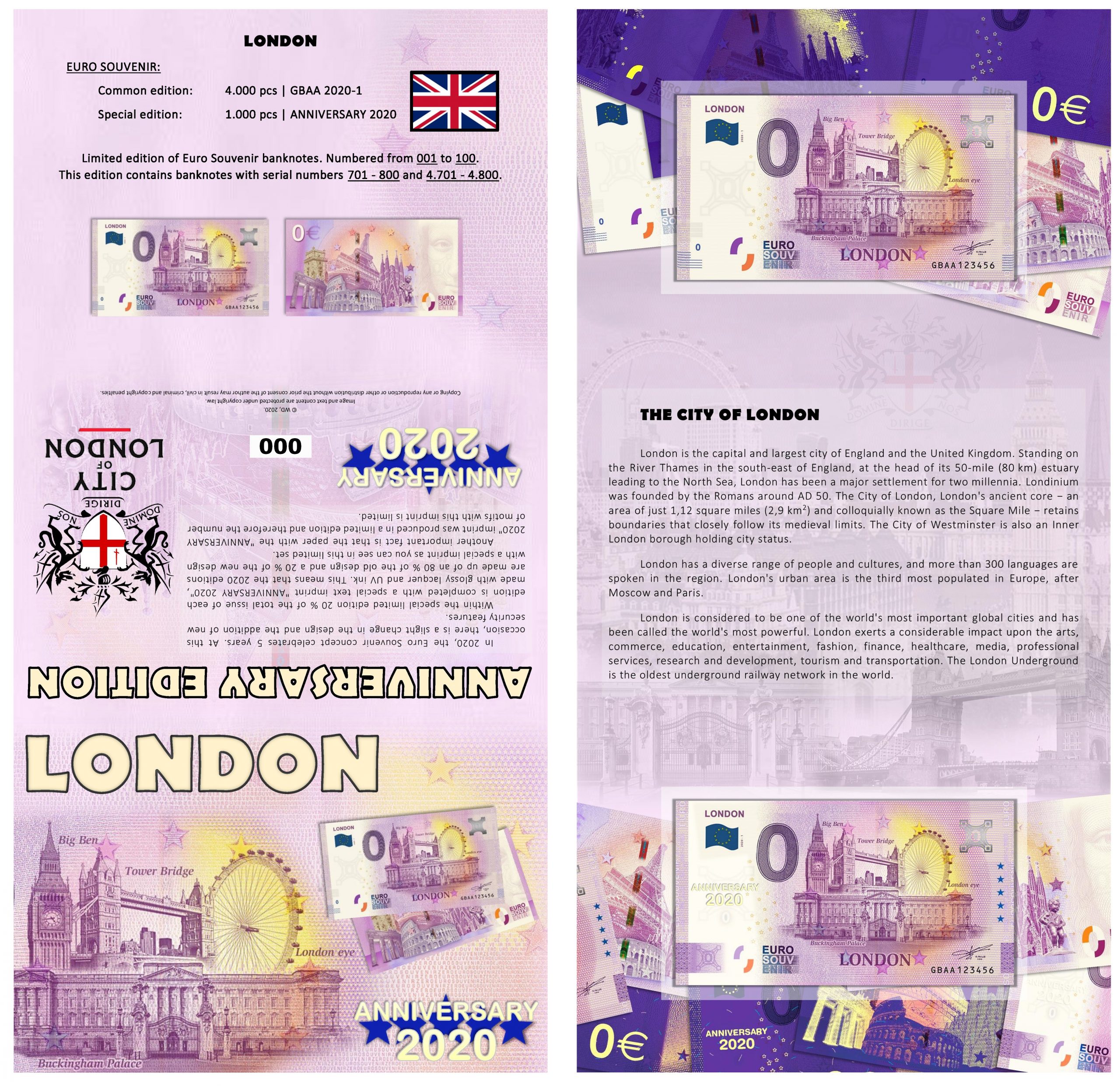 ● 1x issue Euro Souvenir LONDON 2020-1 2020-1 ANNIVERSARY (numbered: 004701-004800).