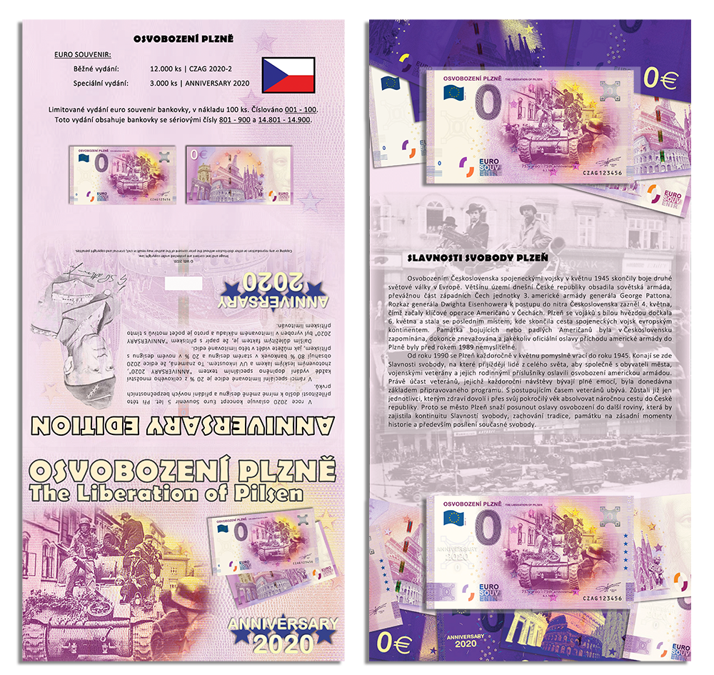 ● 1x issue Euro Souvenir OSVOBOZENÍ PLZNĚ The Liberation of Pilsen CZAG 2020-2 ANNIVERSARY (numbered: 014801-014900).