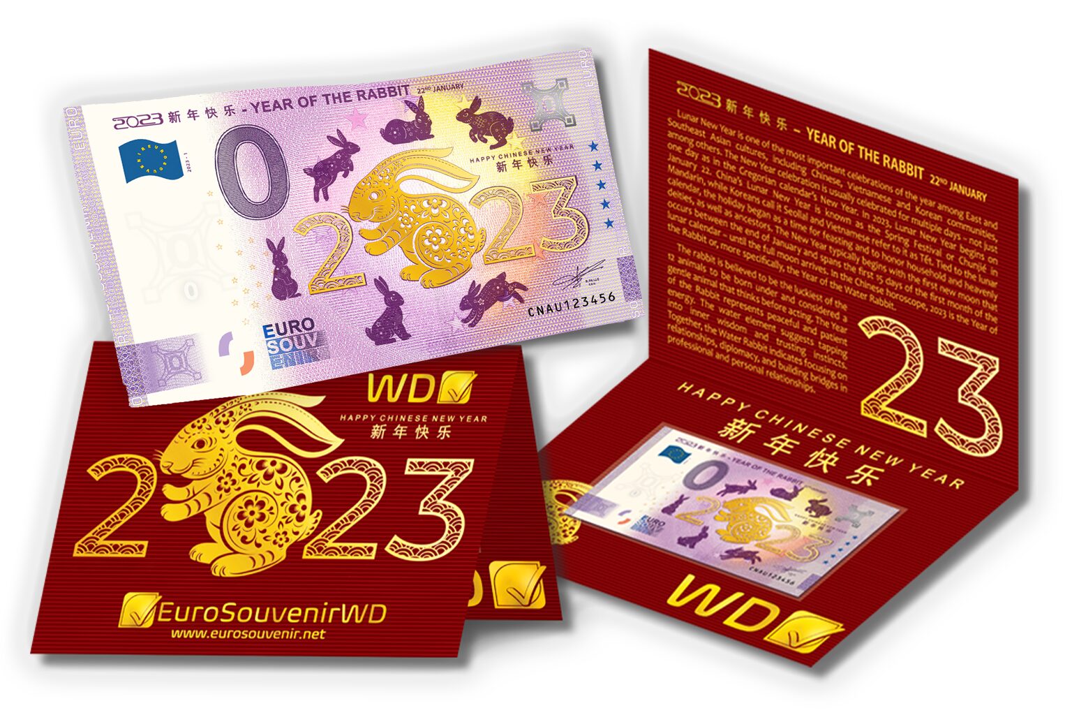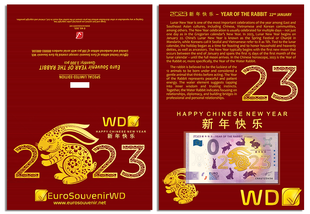● 1x issue Euro Souvenir 2023 新年快乐 – YEAR OF THE RABBIT CNAU 2023-1 IMPRINT (numbered: 000001-000100).