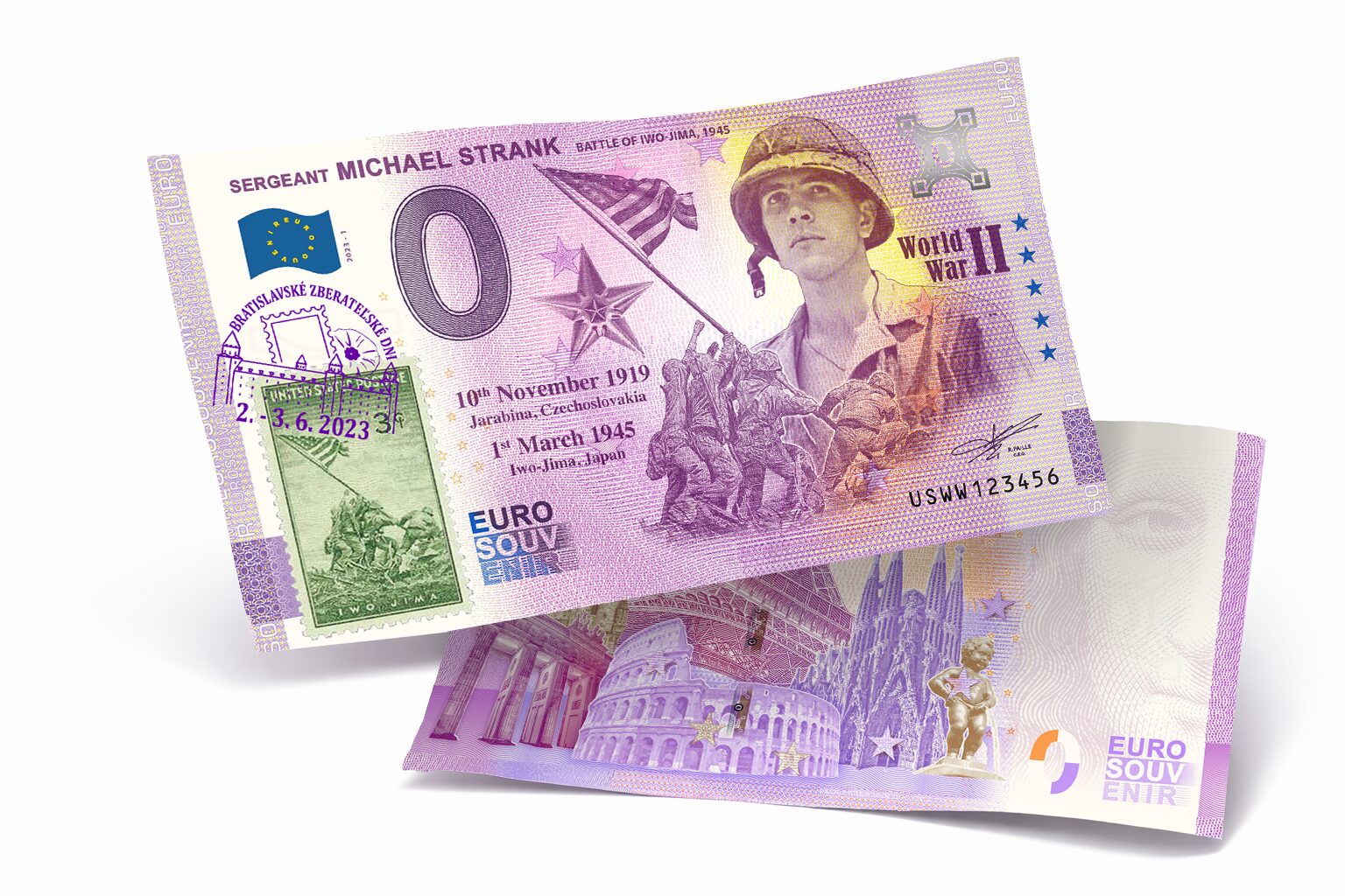 ![<span style="color: #808080;"><small>Euro Souvenir #WD015S2</small></span><br/> <b>MICHAEL STRANK</b> – <strong style="color: #800080;"><small>PEČIATKA/STAMP | "1945"</small></strong> [2023] – Obrázok 2](https://www.wdshop.eu/wp-content/uploads/2023/06/USWW2023-1_PS.jpg)